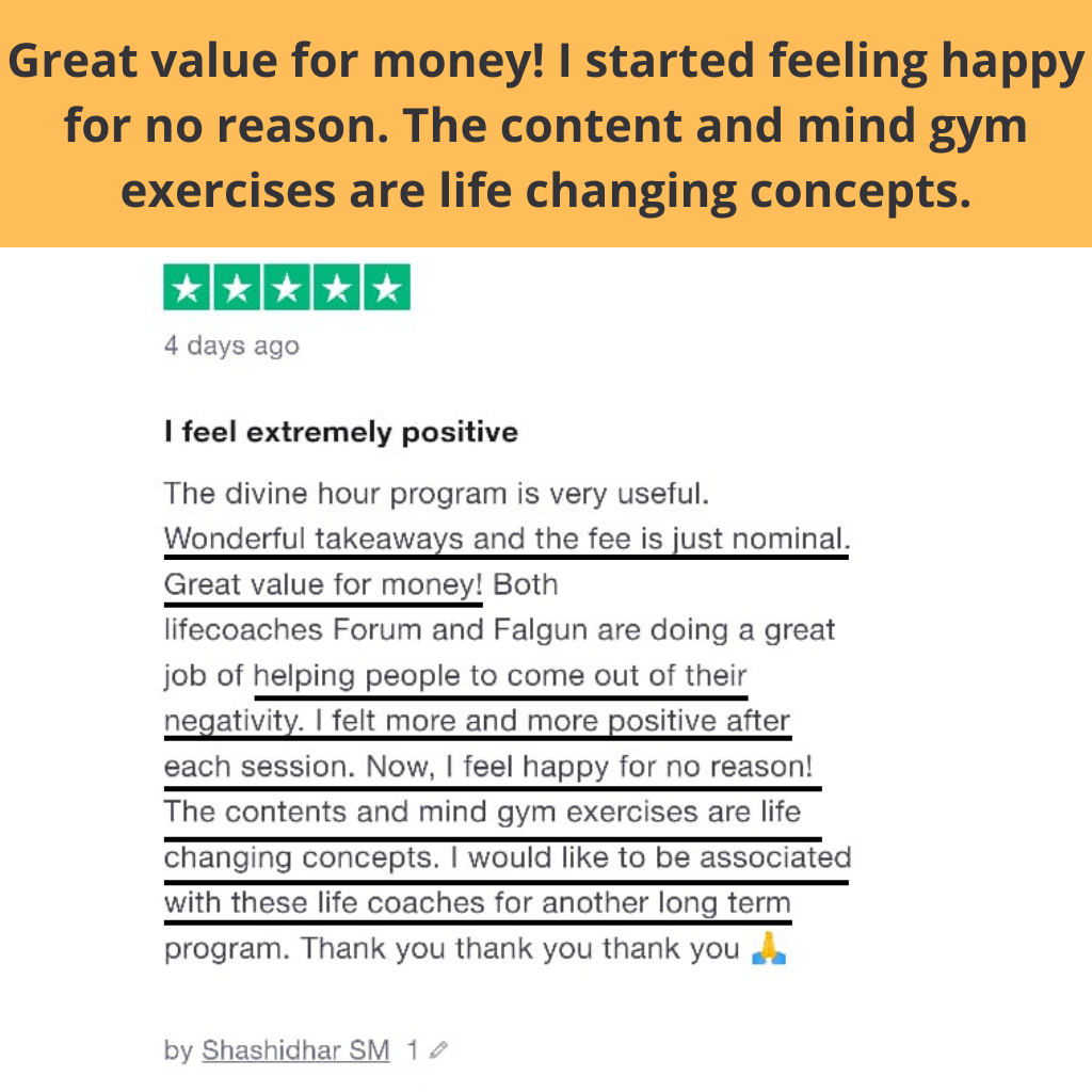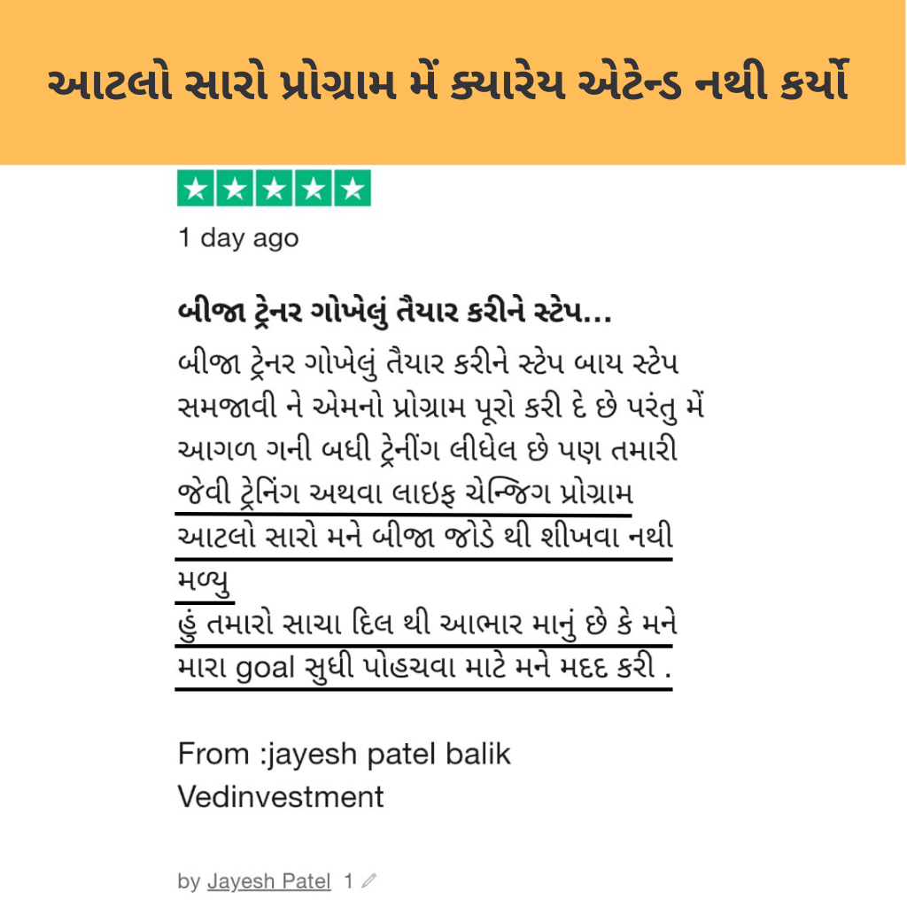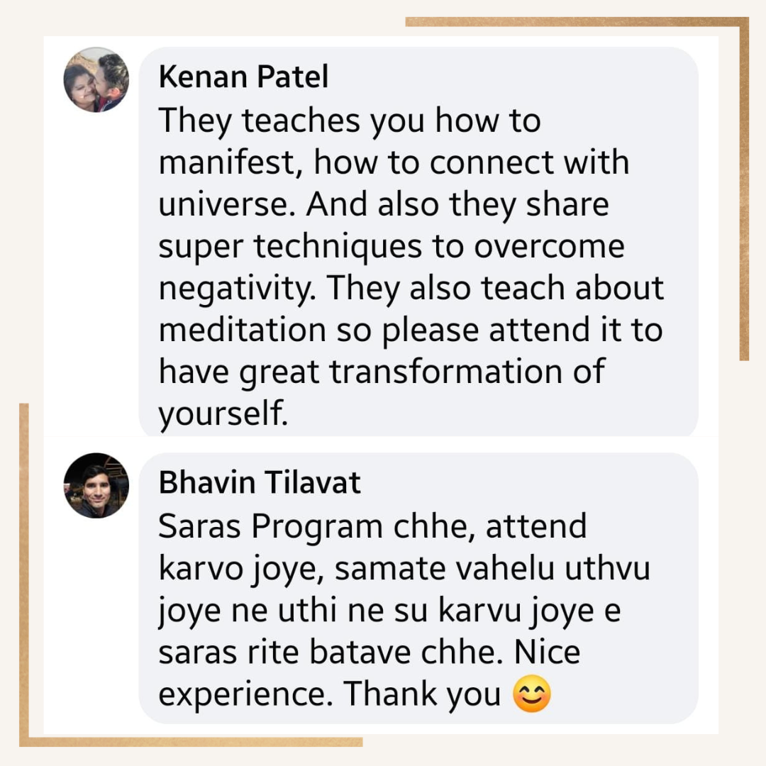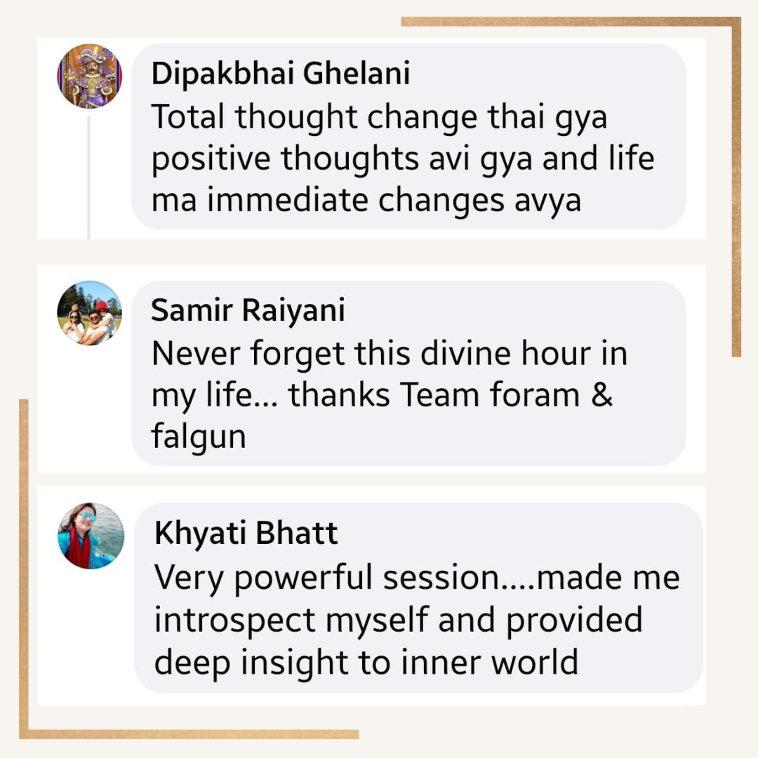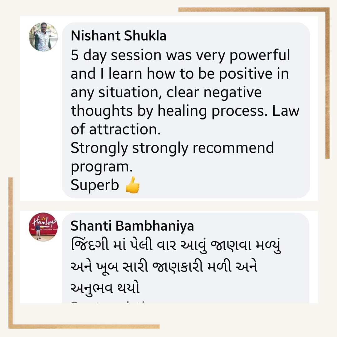 The Divine Hour Workshop is designed for educational and self-development purposes. While we share authentic testimonials, individual results may vary based on personal commitment and implementation. આ workshop માં શીખવવામાં આવતી techniques નો લાભ તમારા personal effort અને dedication પર આધારિત રહેશે.